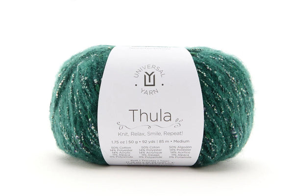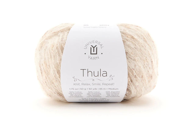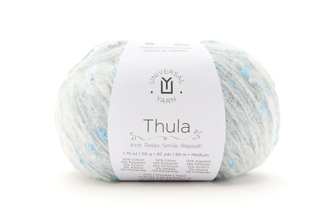 Thula combines the best of cotton, polyester, acrylic, alpaca, and polyamide, creating a blend of softness, durability, and versatility. A strand of fluffy alpaca wraps around a nubby core, resulting in a uniquely textured yarn that is lightweight yet cozy, with a subtle halo.